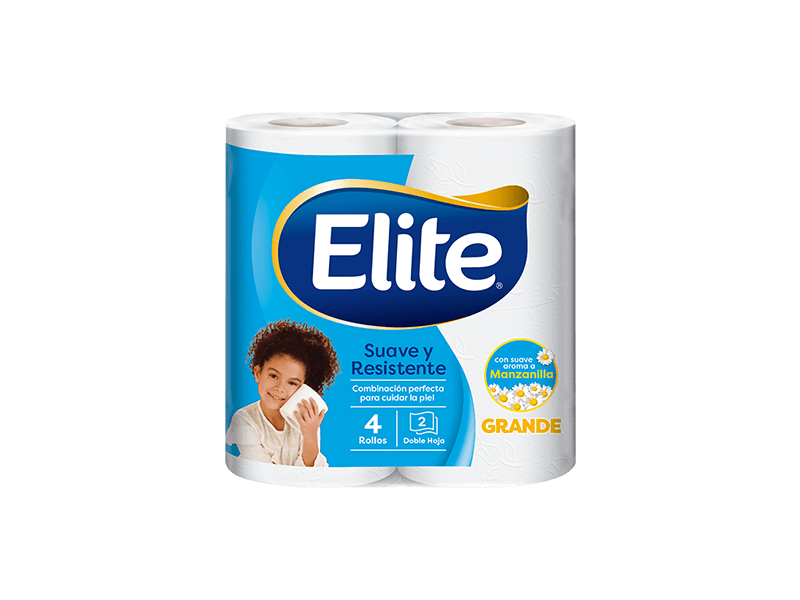 Papel higiénico Elite Suave y Resistente, doble hoja con suave aroma a manzanilla. Combinación perfecta para cuidar la piel.