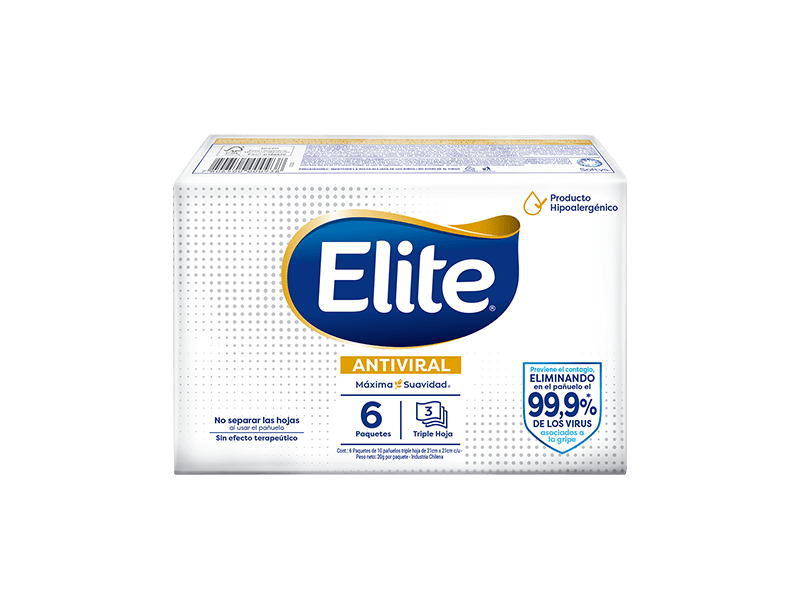 Elite Antiviral, pañuelo hipoalergénico de triple hoja para un máximo cuidado de tu piel. Previene el contagio, eliminando en el pañuelo el 99.9% de los virus asociados a la gripe.