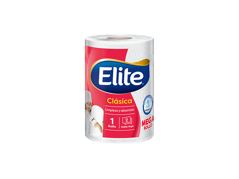 Toallas de papel Elite Clásica Mega Rollo, doble hoja con más metros para un mayor rendimiento.